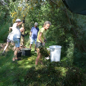 ![]() Viele haben den schönen Tag genutzt, um wieder am Komposttag im Allmende Kontor Gemeinschaftsgarten teilzunehmen. Aus den gesammelten Garten- und Küchenresten wurden zwei große Komposthaufen aufgebaut. Innerhalb von einem Tag erreichten sie die für die Hygienisierung erforderliche Temperatur von 60 Grad Celsius und nach einer Woche waren sie bereits dicht von Pilzhyphen und Strahlenpilzen durchzogen - ein gutes Zeichen für eine gelungene Rotte. Mit dem Absinken der Temperatur kann sofort die Besiedelung des Komposts durch die höheren Bodenorganismen und die Humusproduktion beginnen. Da wir nicht alles Material an einem Tag kompostieren konnten, haben wir einen Häcksler ausgeborgt und alle noch verbliebenen Reste am nächsten Tag zerkleinert. Das war auf dem Tempelhofer Feld zwar etwas umständlich, tat der guten Laune aber offenbar keinen Abbruch. Ende Oktober wird es einen weiteren Komposttag für alle Goldmacherinnen geben. 9. und 10. August 2019: Compost Care in der Floating University